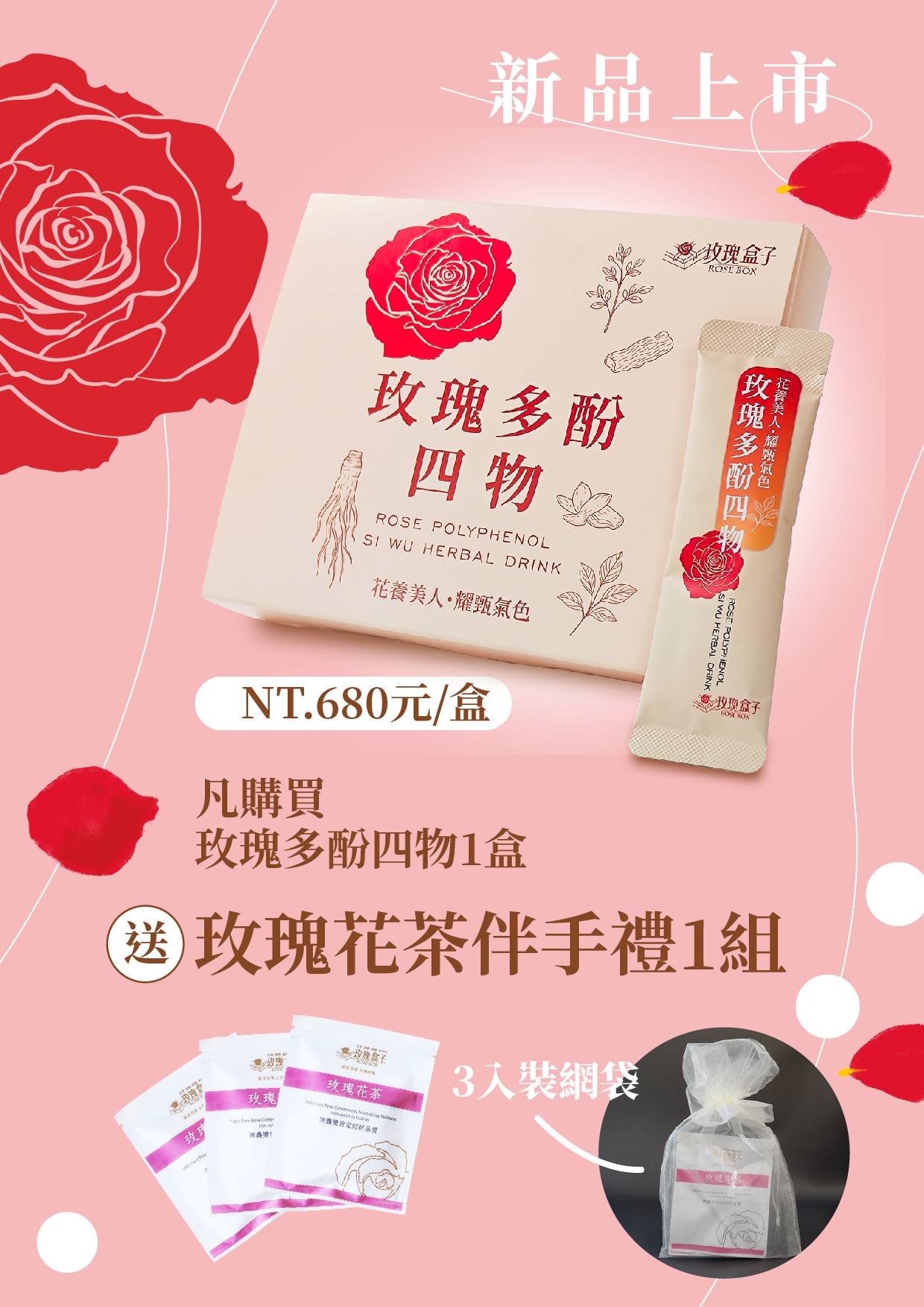新品上市~凡購買玫瑰多酚四物1盒,贈送玫瑰花茶3入1組,買2盒送2組,依此類推,送完為止。